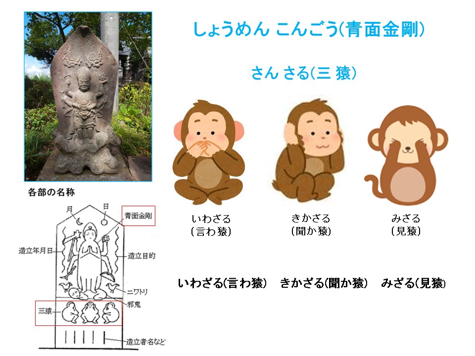 1・2組が交代で本堂と、庚申様・船田合戦終焉之地の石碑の見学を行った。・・2組の生徒さんに庚申様の説明。(午前9時17分)