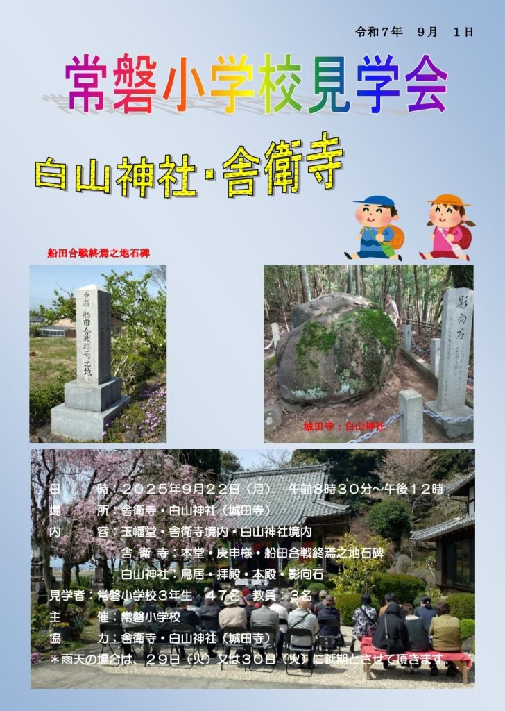数年前から恒例となっている常磐小学校3年生の城田寺:舎衛寺・白山神社見学会を、今年も開催する事になりました。・・常磐歴史研究会有志がお手伝い。
