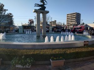JR岡山駅の近くには、「桃太郎」の像が設置されています。🍑(午後3時32分)