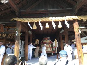 道が旧・高富街道に近づく感じで西方向に進み、山の麓には「岩崎公園」や東には「諏訪神社」が有ります。・・「岩崎みこし祭り」の案内。(‏‎午後2時48分)