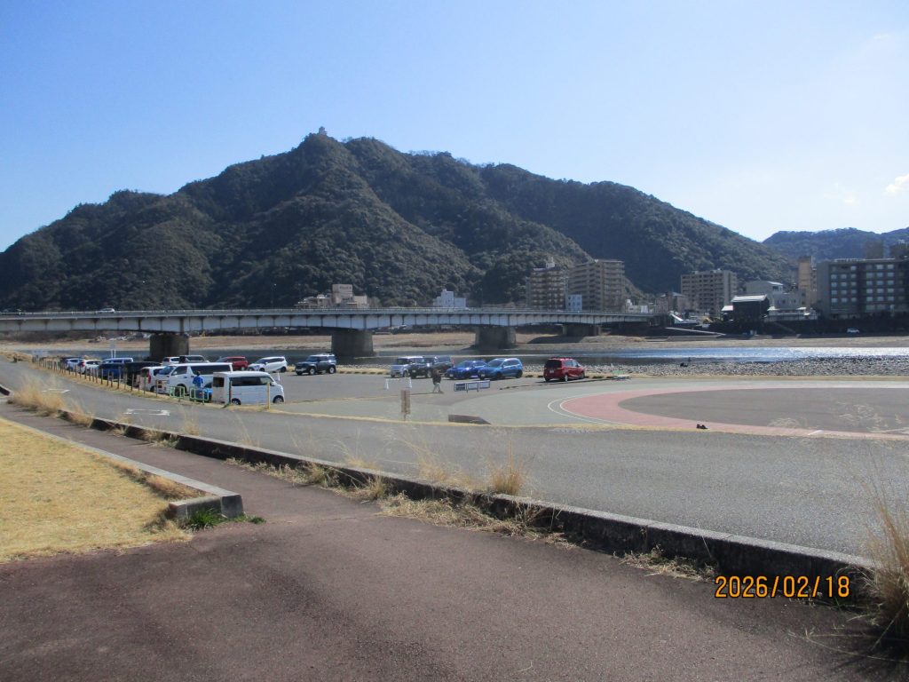 堤防の階段を登り降りして、長良川河畔の「高橋尚子ロード」にやって来ました。・・ここから見る金華山・岐阜城が最高。❗🏯(‏‎午後12時10分)