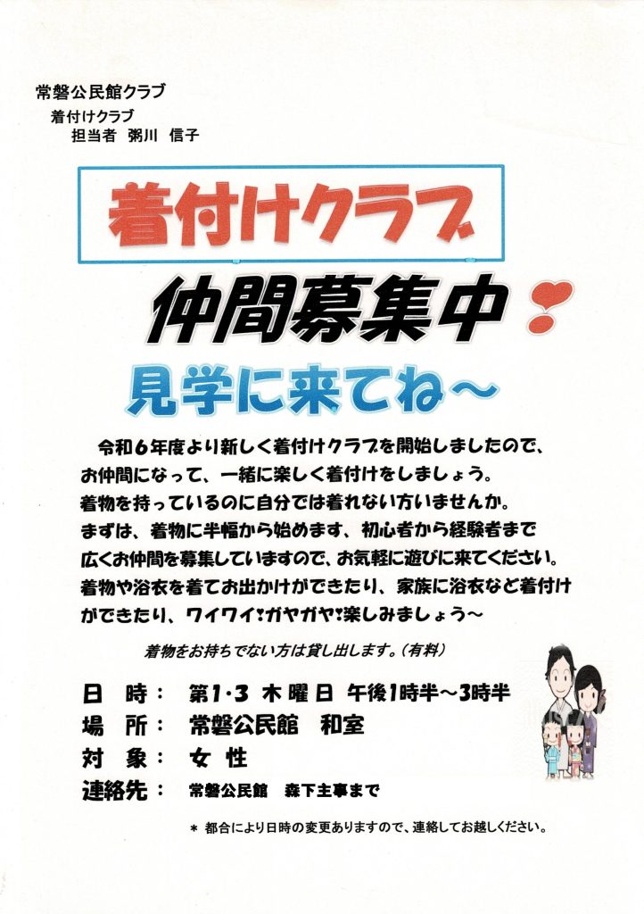 参加希望の方は「常磐公民館 」森下主事に連絡するか、各クラブの開催時に「常磐公民館」を訪問して下さい。